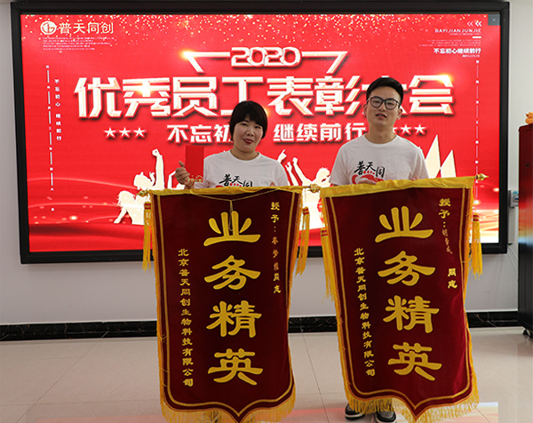 ?2020年7月6日,普天同創舉行6月優秀員工表彰大會。總經理岳維、業務經理周麗為6月業務標兵秦夢雅、胡雪成頒發榮譽錦旗和獎金。希望他們在今后的工作中再接再厲、全力以赴、爭創佳績;也希望其他員工以他們為榜樣,學習他們工作精神、工作態度,能夠在次月中加入他們,獲得自己的榮譽。