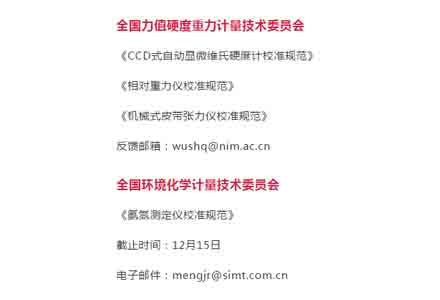 近日,全國力值硬度重力計(jì)量技術(shù)委員會(huì)、全國環(huán)境化學(xué)計(jì)量技術(shù)委員會(huì)發(fā)布《CCD式自動(dòng)顯微維氏硬度計(jì)校準(zhǔn)規(guī)范》、《相對(duì)重力儀校準(zhǔn)規(guī)范》、《機(jī)械式皮帶張力儀校準(zhǔn)規(guī)范》、《氨氮測定儀校準(zhǔn)規(guī)范》等4項(xiàng)國家計(jì)量技術(shù)規(guī)范征求意見稿。