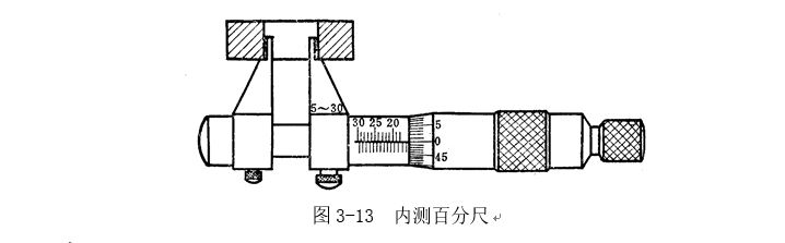 內測百分尺如圖3-13所示,是測量小尺寸內徑和內側面槽的寬度。其特點是容易找正內孔直徑,測量方便。國產內測百分尺的讀數值為0.01mm,測量范圍有5~30和25~50mm的兩種,圖3-13所示的是5~30mm的內測百分尺。內測百分尺的讀數方法與外徑百分尺相同,只是套筒上的刻線尺寸與外徑百分尺相反,另外它的測量方向和讀數方向也都與外徑百分尺相反。