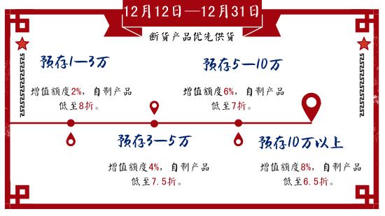 第三重:預存送溫暖:增值+優惠折扣,比放在銀行都劃算,活動時間:12月12日至12月31日。