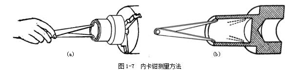 用巳在鋼直尺上或在外卡鉗上取好尺寸的內卡鉗去測量內徑,圖1-8a 所示。就是比較內卡鉗在零件孔內的松緊程度。如內卡鉗在孔內有較大的自由擺動時,就表示卡鉗尺寸比孔徑內小了;如內卡鉗放不進,或放進孔內后緊得不能自由擺動,就表示內卡鉗尺寸比孔徑大了,如內卡鉗放入孔內,按照上述的測量方法能有1~2mm的自由擺動距離,這時孔徑與內卡鉗尺寸正好相等。測量時不要用手抓住卡鉗測量,圖1-8b 所示,這樣手感就沒有了,難以比較內卡鉗在零件孔內的松緊程度,并使卡鉗變形而產生測量誤差。