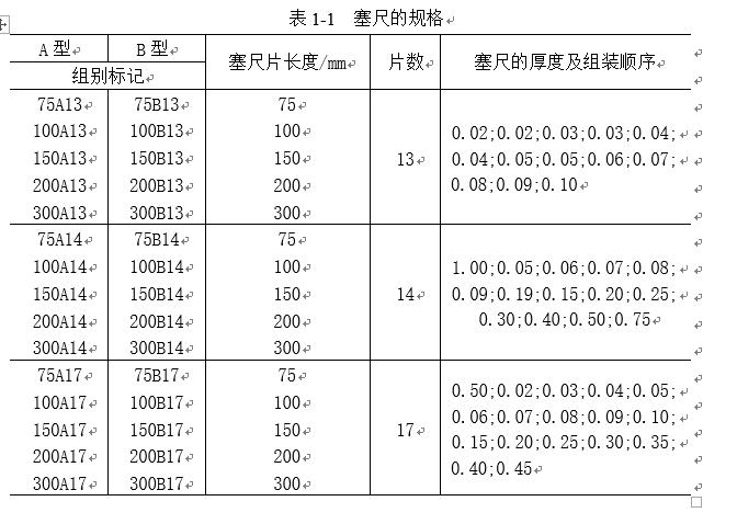 塞尺又稱厚薄規或間隙片。主要用來檢驗機床特別緊固面和緊固面、活塞與氣缸、活塞環槽和活塞環、十字頭滑板和導板、進排氣閥頂端和搖臂、齒輪嚙合間隙等兩個結合面之間的間隙大小。塞尺是由許多層厚薄不一的薄鋼片組成(圖1-10)按照塞尺的組別制成一把一把的塞尺,每把塞尺中的每片具有兩個平行的測量平面,且都有厚度標記,以供組合使用。
